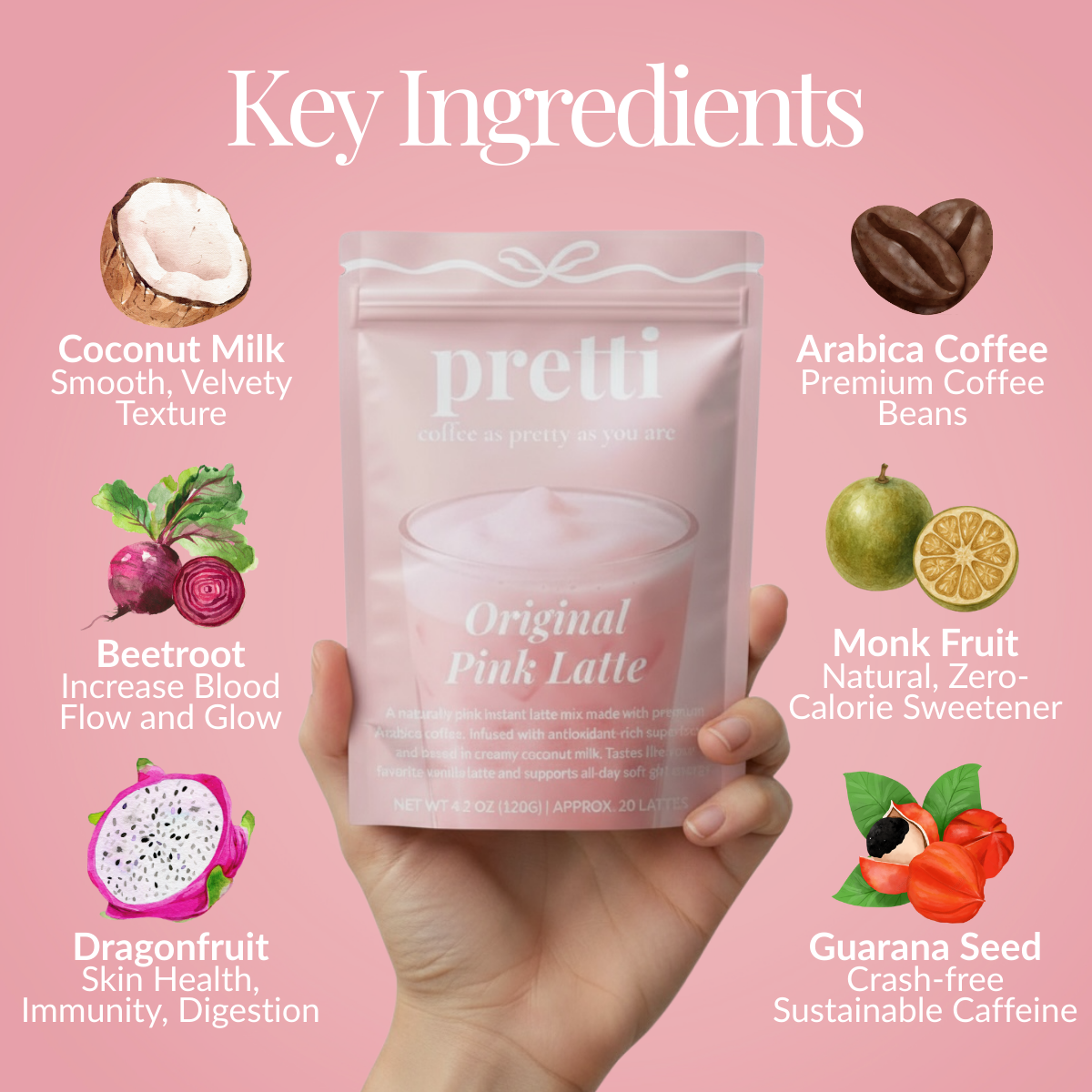 Pretti uses a unique blend of caffeine from arabica coffee and guarana for calm, focused energy that lasts.