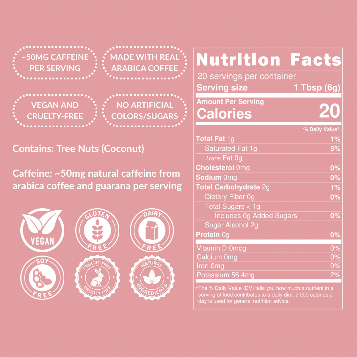 About 50mg of caffeine per tablespoon (around the same as a matcha). Double it for 100mg if you want stronger energy!